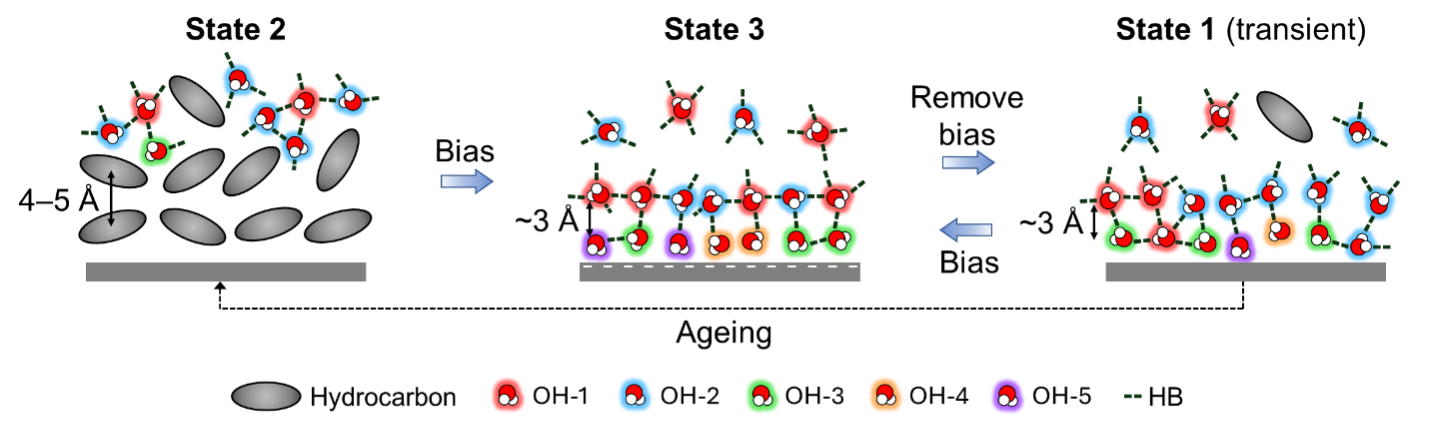 The model’s final phase, State 3, occurs when a negative electric voltage is applied to graphite. This voltage acts as a molecular vacuum cleaner, repelling contaminants and attracting pristine water back to the surface. In this electrified state, water organizes into a stable, diverse network of hydrogen bonds that can be precisely controlled. Ultimately, this discovery acts as a dial, allowing scientists to control the interface.